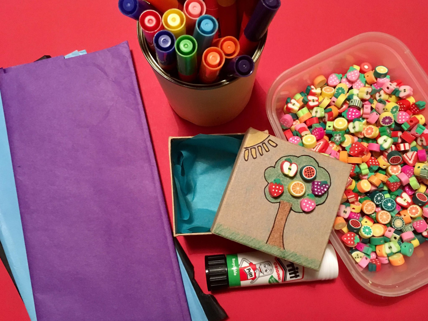 You will need: A small box with a lid; pens or paint to decorate your box; fruit beads; a gluestick; tissue paper for inside your box, and a pair of scissors. If you cannot get fruit beads you could use small balls of coloured tissue to make your fruits.
